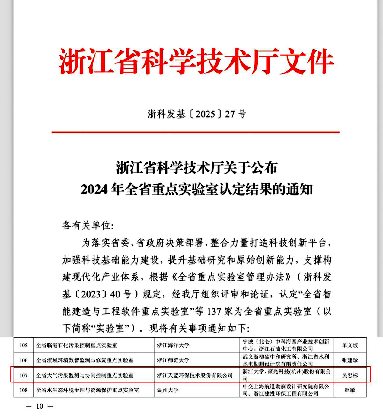 2025年6月4日,浙江省科技廳發(fā)布《浙江省科學技術廳關于公布2024 年全省重點實驗室認定結果的通知(浙科發(fā)基〔2025〕27號)》,由浙江天藍環(huán)保技術股份有限公司牽頭,浙江大學和聚光科技(杭州)股份有限公司共建的“全省大氣污染監(jiān)測與協同控制重點實驗室”獲批組建,成為全省環(huán)境領域唯一以企業(yè)牽頭建設的省級重點實驗室。